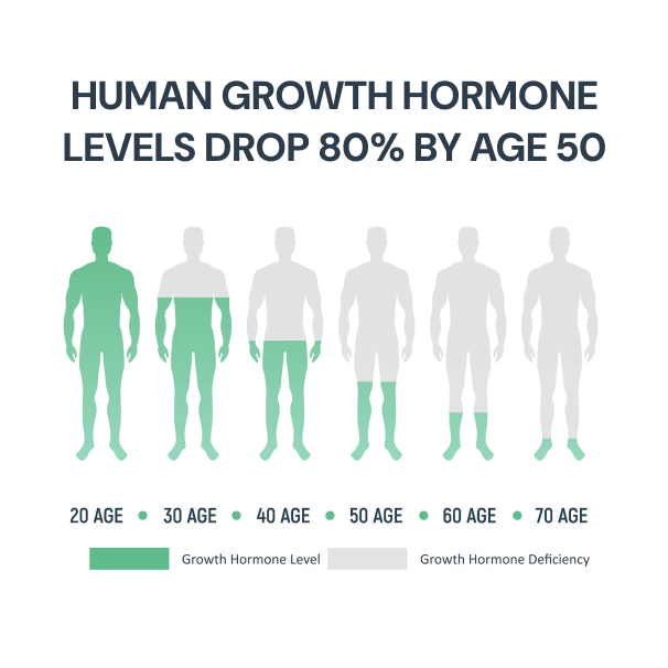 After age 30, growth hormone production drops 14% per decade. This decline doesn't just affect muscle mass and recovery—it directly impacts bone mineral density. Lower GH levels mean reduced calcium absorption, decreased bone formation, and increased risk of osteoporosis.